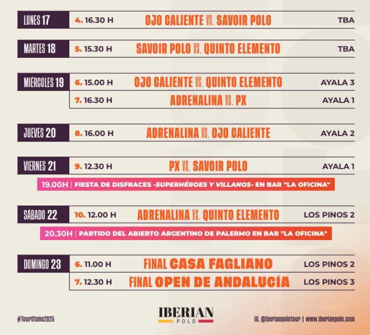 A lo largo de la semana, el Iberian Polo Tour ofrecerá una intensa agenda de partidos que enfrentará a equipos como Ojo Caliente, Savoir Polo, Quinto Elemento, Adrenalina y PX en distintas canchas de Ayala y Los Pinos. Desde el lunes hasta el sábado se sucederán duelos decisivos que culminarán el domingo con las finales de la Casa Fagliano y del Open de Andalucía, marcando el cierre de una semana clave para el torneo.