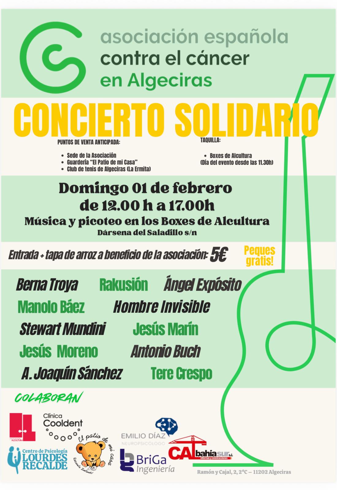 La Asociación Española Contra el Cáncer (AECC) en Algeciras celebrará el próximo domingo 1 de febrero un concierto solidario con el objetivo de recaudar fondos para apoyar a la entidad en la atención a pacientes oncológicos y sus familias.
