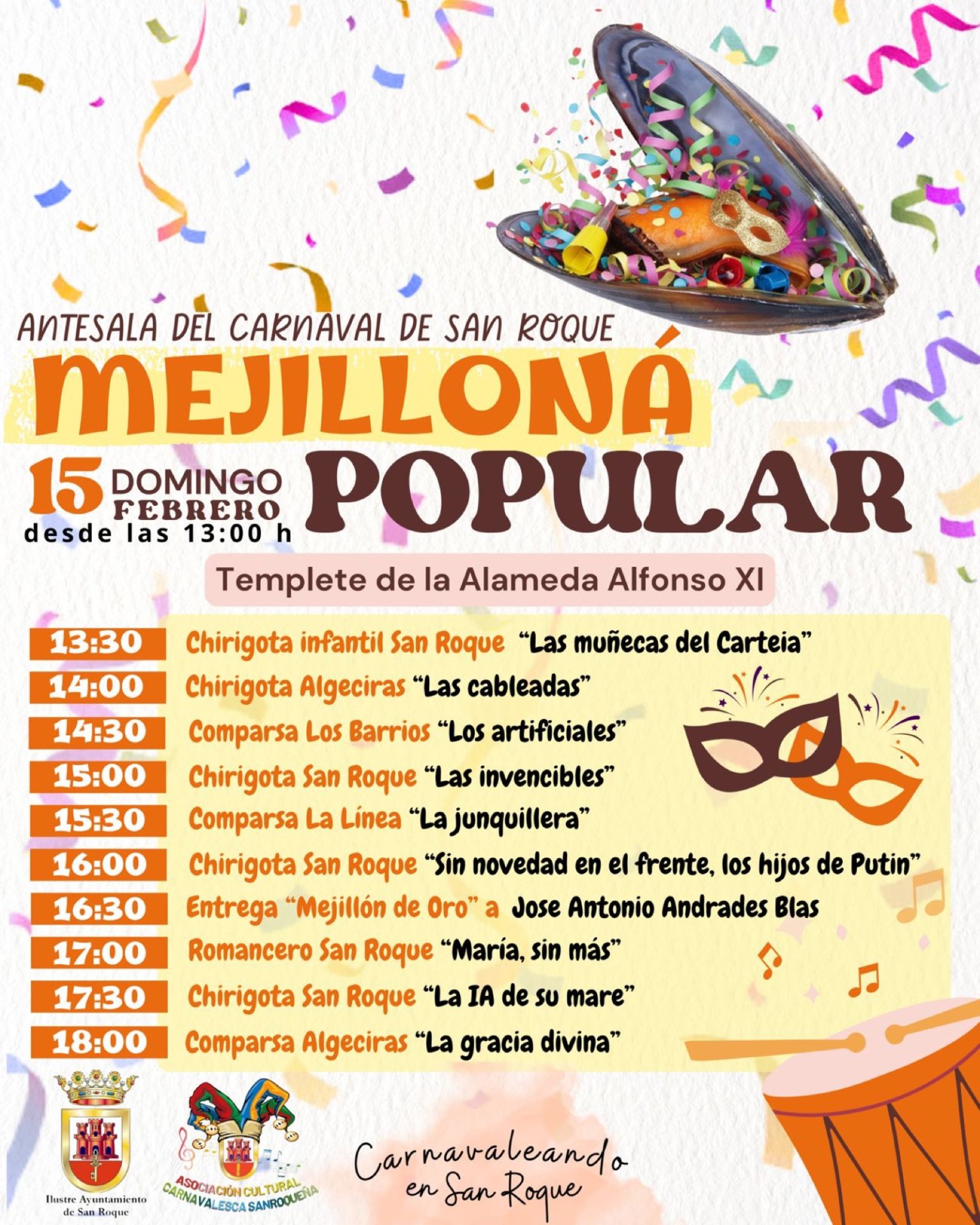 La Asociación Cultural Carnavalesca Sanroqueña organiza con la colaboración del Ayuntamiento de San Roque su II Mejilloná Popular, que se celebrará este domingo 15 de febrero, en la que habrá actuaciones y la entrega del Mejillón de Oro a José Antonio Andrades.