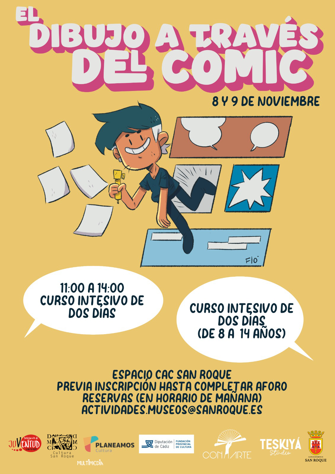 El estudio de arte gaditano Teskiyá Studio impartirá en las mañanas del 8 y 9 de noviembre, de 11:00 a 14:00 horas en el Centro de Arte Contemporáneo de San Roque un curso intensivo de dibujo. En este taller se pretende acercar a los jóvenes de entre 8 y 14 años a la creación de personajes e historietas.