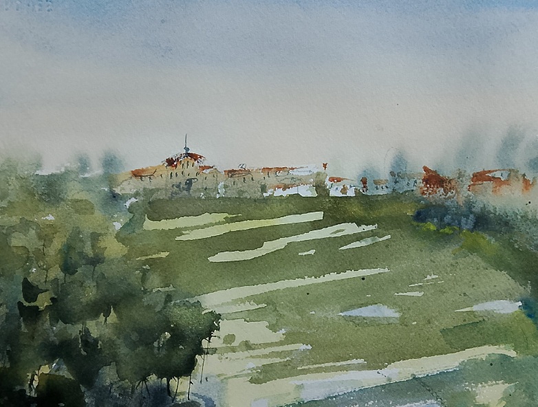 For this watercolor, I worked with several types of greens, mixing yellows with different blues from the palette. For the building, I used greys created from broken colors, avoiding direct black. And for the shadows, elongated by the low sun, I used muted yet intense blues to reinforce that late-afternoon light.»